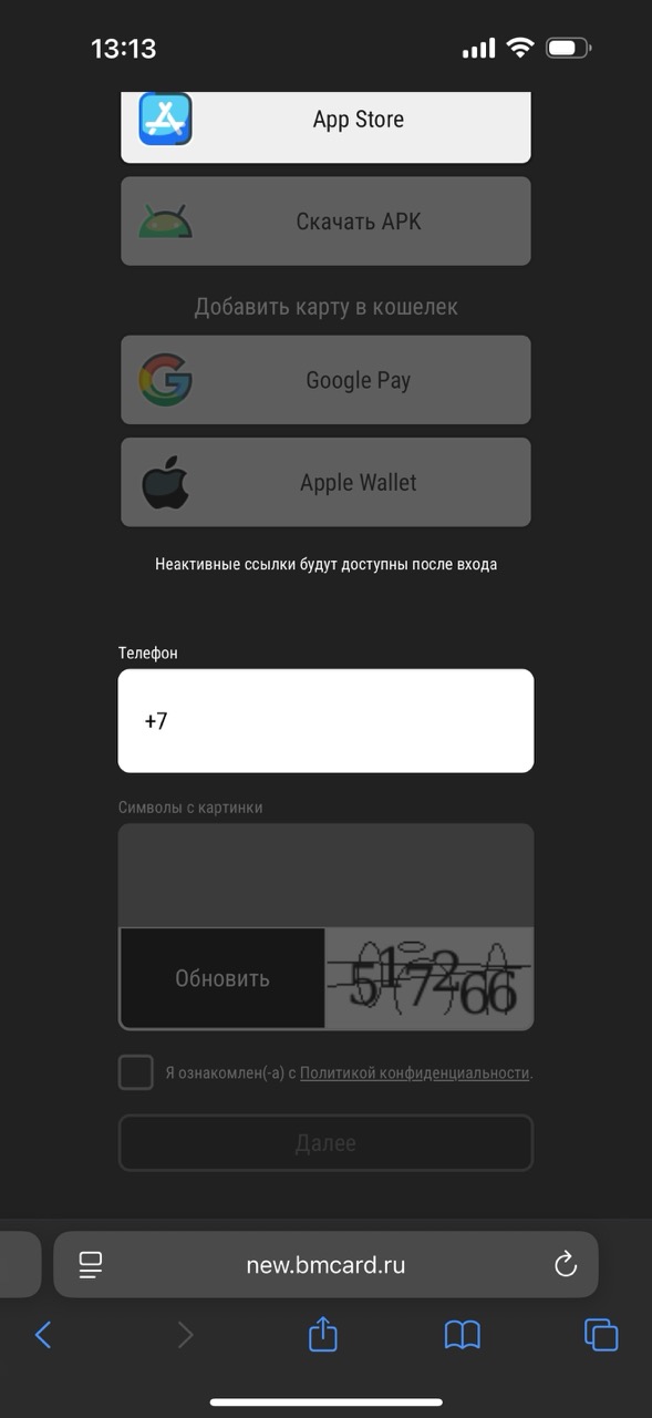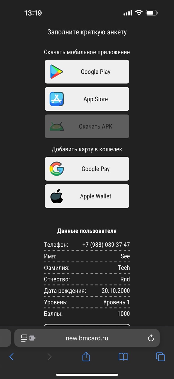 Для регистрации в бонусной системе пройдите по ссылке https://new.bmcard.ru/?6DWmXKyM или приложите бонусную карту к верхней части смартфона, для того, чтобы открыть ссылку.